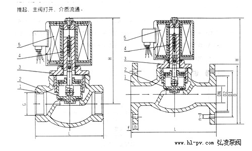 本閥為分步動作直接先導式電磁閥,可根據斷電時所處開、關狀態的不同,可分為常閉式電磁閥和常開式電磁閥。常閉電磁閥,線圈通電后,銜鐵在電磁力作用下先帶動副閥閥塞提起,主閥閥杯上的流體經副閥流走,減少了作用在主閥閥杯上的壓力,當主閥閥杯上的壓力減少到一定值時,銜鐵帶動主閥閥杯,并利用壓差而使主閥閥杯開啟,介質流通。線圈斷電后,電磁力消失,銜鐵因自重下落復位。同時依靠介質壓力,主副閥得以緊密關閉。常開電磁閥,線圈通電后由于吸力作用,動鐵芯下移,把副閥閥塞壓下,副閥關閉,主閥閥杯內壓力上升,當壓力升到一定值時,主閥閥杯的上下壓差一樣,由于電磁力作用,動鐵芯失去主閥閥杯下,壓緊主閥閥座,閥門關閉。線圈斷電時,電磁吸力為零,副閥閥塞和支鐵芯由于彈簧作用向上提起,副閥打開,主閥閥杯上的流體經副閥流走,減少了作用在主閥閥杯上的壓力,當主閥閥杯上的壓力減少到一定值時,利用壓差把主閥閥杯推起,主閥打開,介質流通。