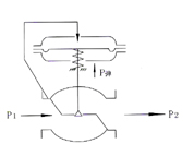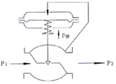 閥前壓力控制(K),其初始閥芯的位置在關(guān)閉狀態(tài)。當閥前壓力P1通過閥芯、閥座的節(jié)流后變?yōu)殚y后壓力P2,同時P1通過管線輸入上膜室作用在膜片上,其作用力與彈簧的反作用力相平衡時閥芯位置決定了閥的開度,從而控制閥前壓力。 當閥前壓力P1增加時,P1作用在膜片上的作用力也隨之增加。此時,膜片上的作用力大于設(shè)定彈簧的反作用力,使閥芯向離開閥座方向移動,導致閥的開度變大,流阻變小,P1向閥后泄壓,直到膜片上的作用力與彈簧反作用力相平衡為止,從而使P1降為設(shè)定值。同理,當閥前壓力P1降低時動作方向與上述相反,這就是閥前壓力調(diào)節(jié)的工作原理。