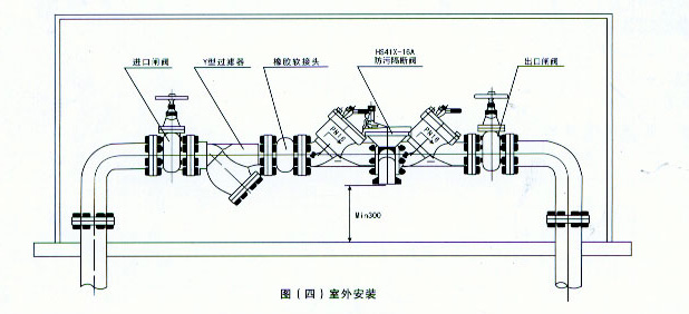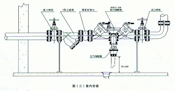 ①帶過濾防污隔斷閥必須水平安裝,安裝地點環境應清潔,有足夠的維護空間,安全排水器或(空氣隔阻器)出口離地面主度大于300mm,并不被水或雜物所淹沒。②安裝地域應設排水設施。③閥前應裝閘閥(蝶閥)過濾器及橡膠軟接頭(或伸縮器),閥后裝閘閥(蝶閥)。其示意圖如下:(圖三 圖四)